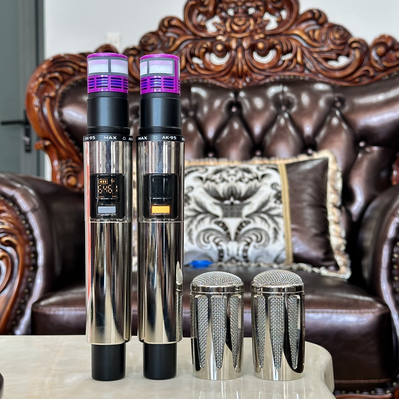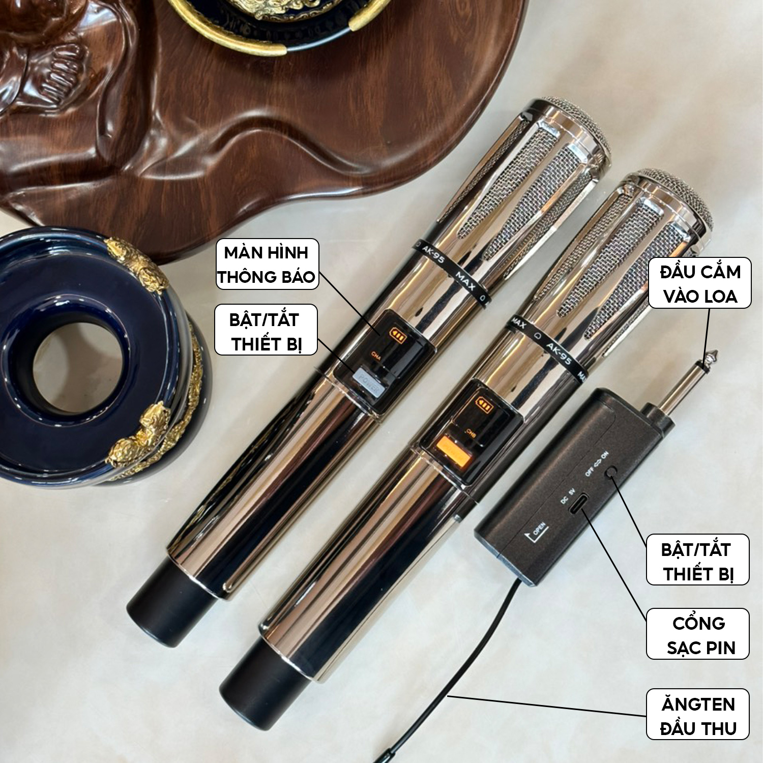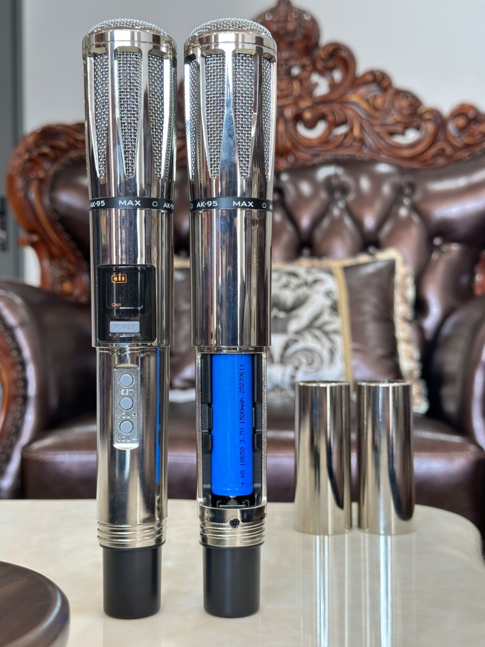 Micro AK95 được trang bị hai micro không dây và một đầu thu micro, giúp bạn tự do di chuyển và biểu diễn mà không gặp rắc rối với dây cáp. Ngoài ra, sản phẩm còn đi kèm với hai chống lăn, ba pin 18650, một cáp Type-C và một cáp micro, đảm bảo sự tiện lợi và linh hoạt cho quá trình sử dụng.